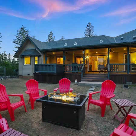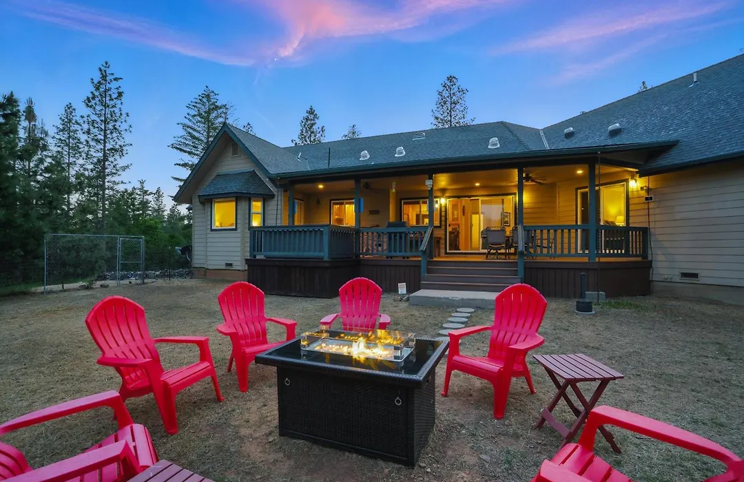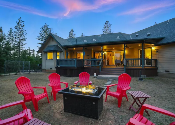 The 4-bedroom Moonrise Lodge - A Large Vacation Home In Mariposa includes a car park and a patio with views of the mountain.